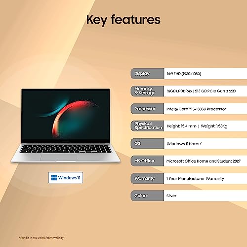 Operating System: Windows 11 Home | Pre-Installed Software: MS Office Home & Student 2021, Live Message, Live Wallpaper, McAfee Live Safe (Trial), Screen Recorder, Samsung Gallery, Samsung Flow, Samsung Notes, Samsung Recovery, Samsung Settings, Studio Plus, Samsung Update, Samsung Security, Quick Share, Galaxy Book Smart Switch, Samsung Pass, Samsung Multi Control