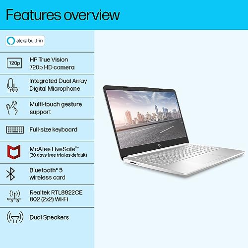 Other Features: HP True Vision 720p HD camera with integrated dual array digital microphones|Networking: Realtek RTL8822CE 802.11a/b/g/n/ac (2×2) Wi-Fi and Bluetooth 5 wireless card|Keyboard & Pointing Device: Full-size, natural silver keyboard |Battery: HP Long Life 3-cell, 41 Wh Li-ion