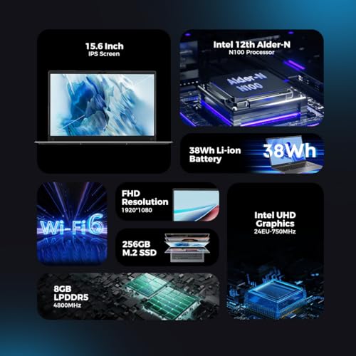 Chuwi GemiBook Plus 15.6" Laptop, 8GB RAM 256GB SSD, Windows 11, Intel N100 (Upto 3.4GHz), WiFi 6, USB-A 3.0, Webcam, Bluetooth 5.2, HDMI Port, 38Wh, 1.7kg (Iron Gray)