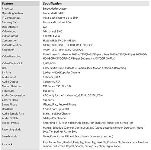 Smart PhoneiPhone, iPad, Android Phone Trigger EventsRecording, PTZ, Tour, Video Push, Email, FTP, Snapshot, Buzzer and Screen Tips Recording ModeManual, Schedule (General, Continuous), MD (Video detection: Motion Detection, Video Loss, Tampering), Alarm, Stop Search ModeTime /Date, Alarm, MD and Exact Search (accurate to second) PlaybackPlay, Pause, Stop, Rewind, Fast play, Slow play, Next file, Previous file,Next camera, Previous camera, Full screen, Repeat, Shuffle, Backup, selection, Digital